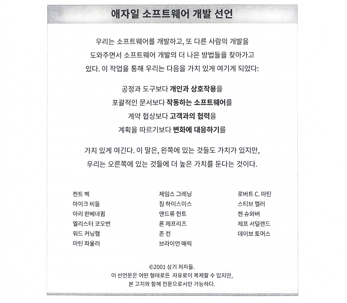 일부 회사는 강사나 컨설턴트, 엄격한 규칙과 절차를 잔뜩 갖추고 ⭐️애자일을 전면적으로 실행하기 보다는, 납득이 되는 몇 가지 원칙만 고수하고 나머지는 폐기한다. "형식적인 방법론을 사용하지 않은 지 오래 되었어요."
