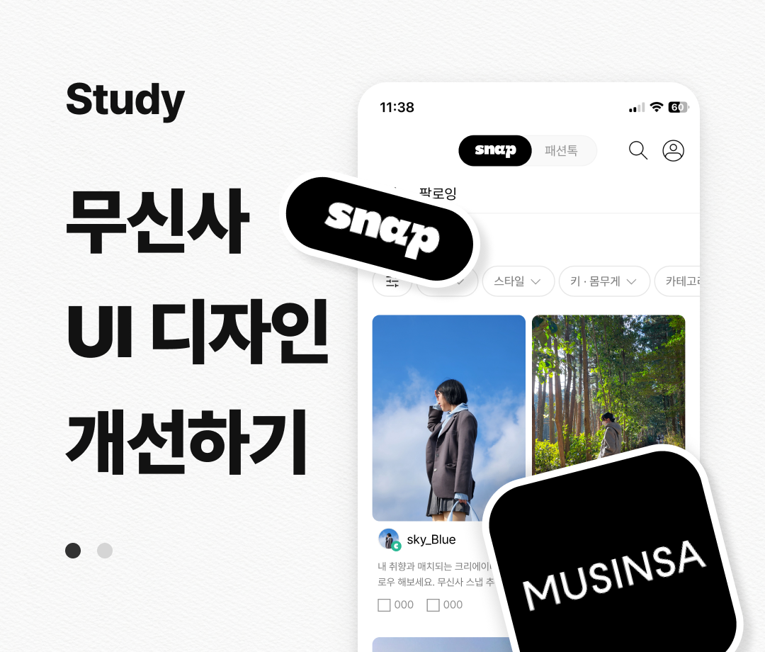 카드 UI 실습까지 활용할 수 있는 '스냅' 페이지가 있는 무신사 앱으로 선정했다.