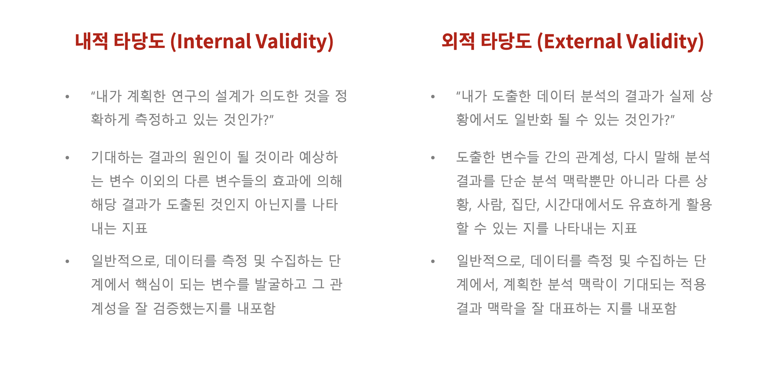 | 측정 및 수집에 의한 데이터가 얼마나 일정하게 산출되는지를 의미 | 실제 수집 및 측정하고자 하는 개념을 정확하게 측정하는지를 의미 |