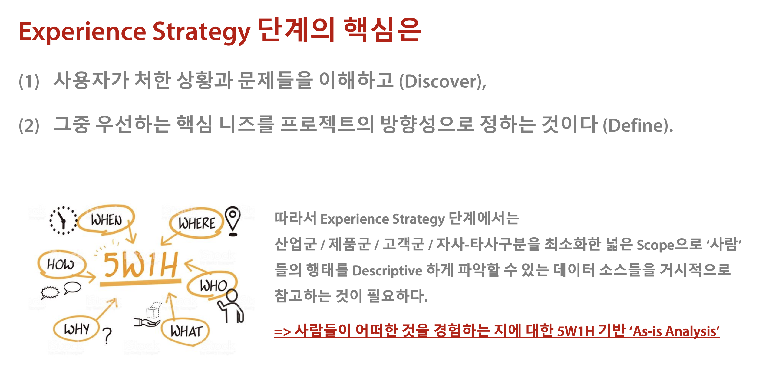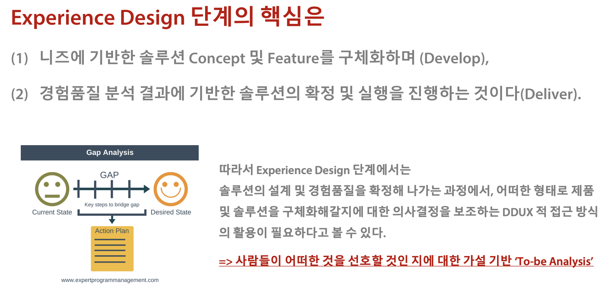- Experience Strategy 단계에서 도출한 니즈 혹은 솔루션의 대략적인 방향성을 바탕으로 실제 솔루션을 기획하는 단계이기 때문에, 1차적으로는 솔루션을 구성하게 될 경험품질 속성에 대한 변수화를 통한 가설 수립이 필요