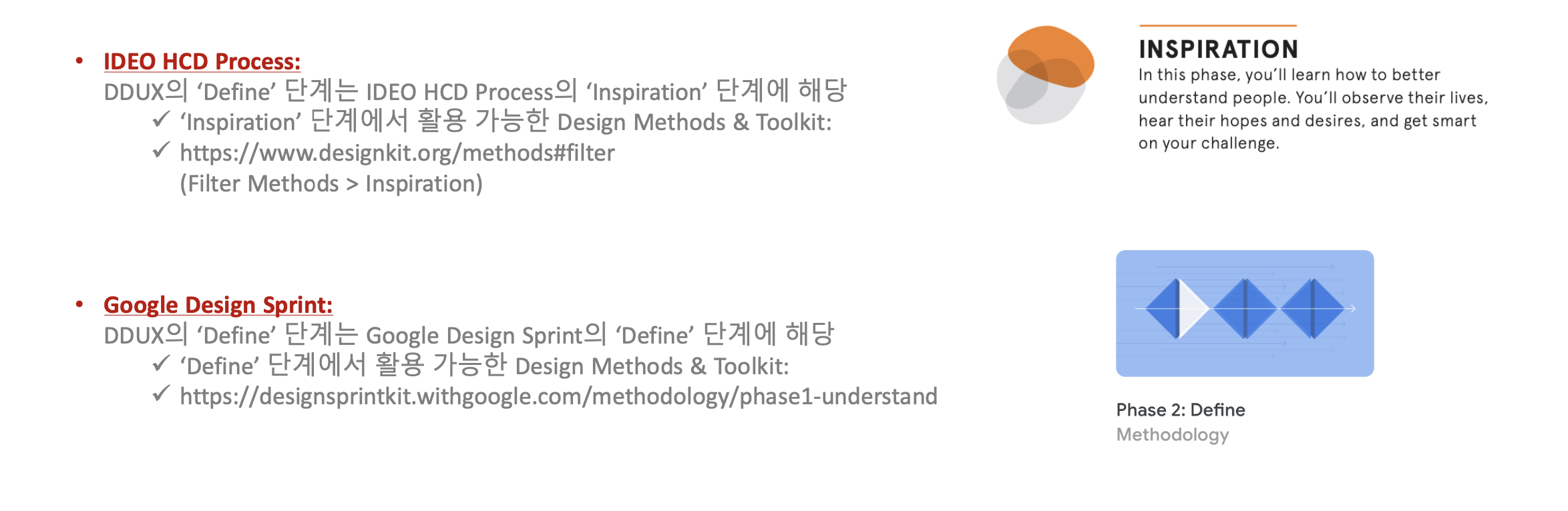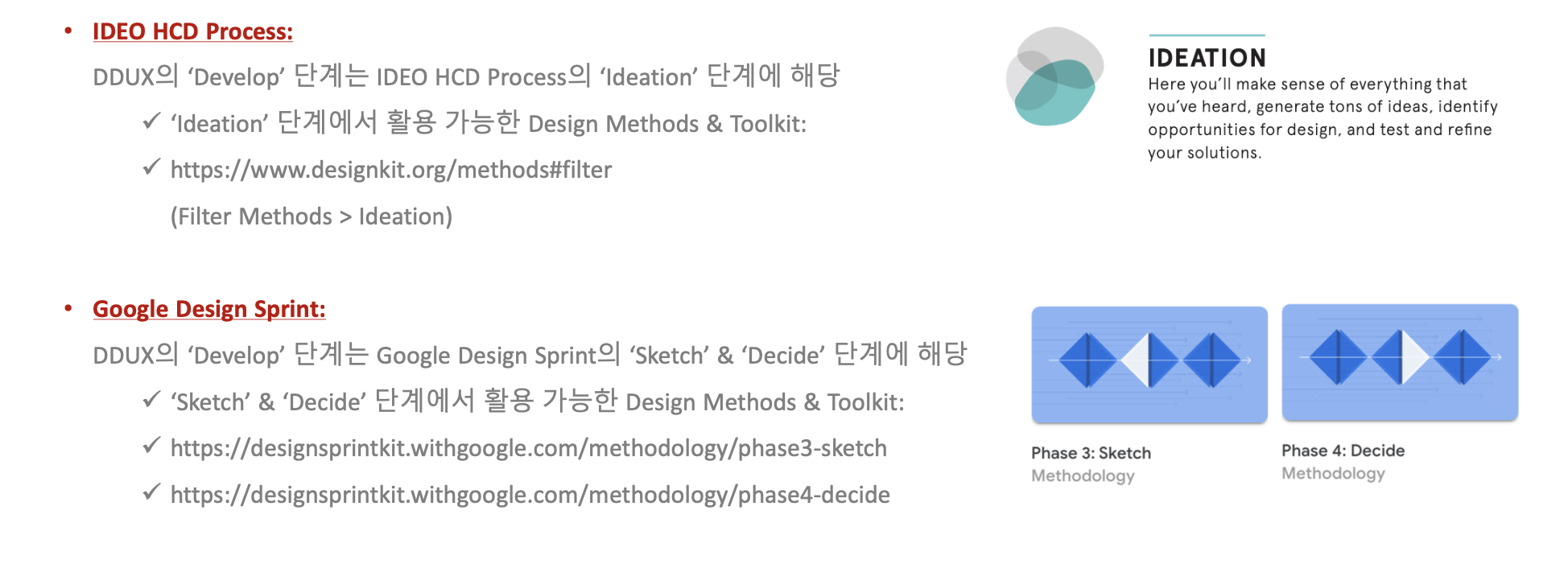 - 디자인 조직 내부라면 IDEO와 Google Sprint에서 제공하는 툴을 활용