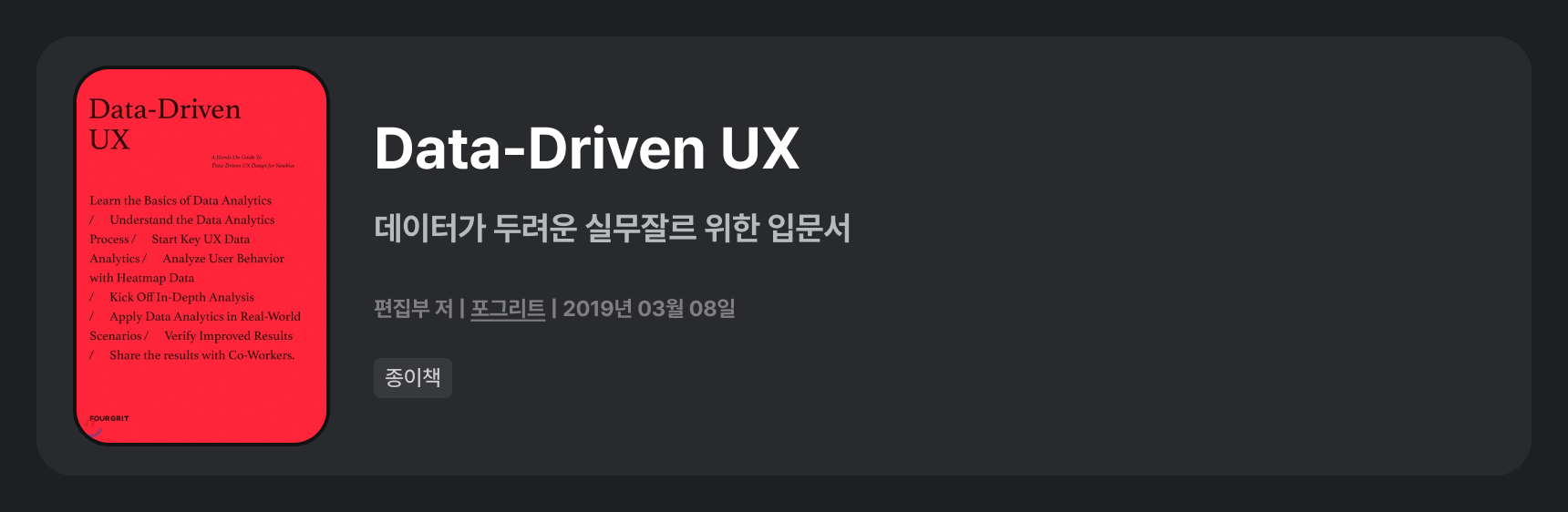 2년 전쯤, 선배에게 추천받아서 구매한 후 1시간 안에 다 읽었었던 책이다. 그러나 최근 갑자기 '그로스해킹이 뭐지?' 분명 책을 읽었는데.. 해서 다시 책을 읽게 되었다. 다시 보니 이 책의 저자가 내가 좋아하는 '라이언 홀리데이'였다. 책 취향은 돌고 돌아 비슷한가 보다. 그로스해킹에 대해 가장 쉽게 설명되어 있는 좋은 책. 작고 얇아서 부담 없이 읽을 수 있다.
