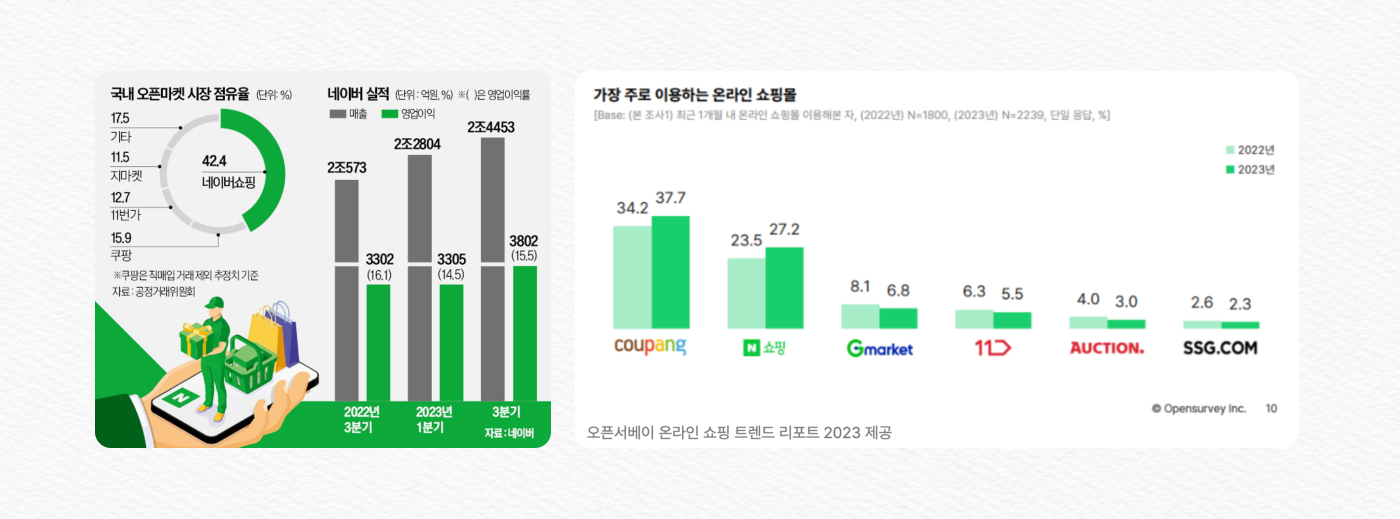 - 쇼핑몰 업체 거래액 및 이커머스 시장 점유율 1위 자리를 지켜왔으나, 2022년 1분기 쿠팡에 1위를 빼앗김