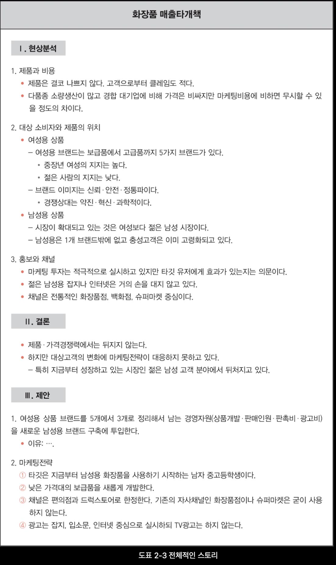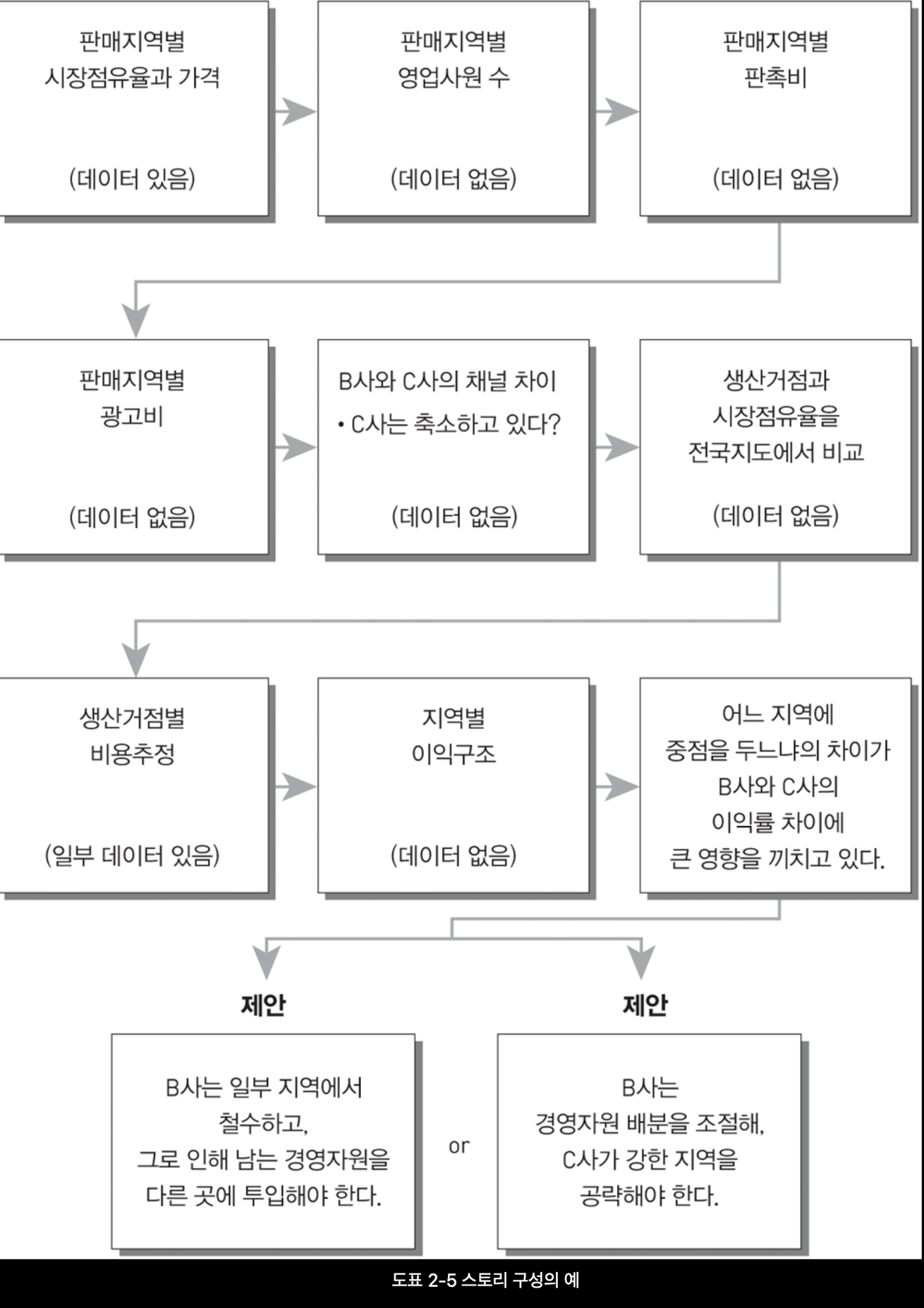 구체적으로는 우선 스토리 구성을 생각해야 한다. “현재 상황을 분석하면 이런 분석결과를 얻을 수 있을 거야. 그중에서도 이 문제의 진짜 원인은 이것이고, 그 결과 몇 가지 전략을 생각할 수 있는데, 이 전략이 가장 효과적이야”라는 스토리를 충분한 분석이나 증거가 없는 단계에서 완성한다.