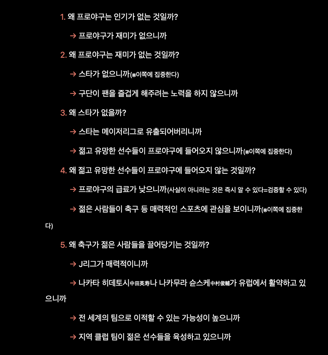 - “왜 프로야구는 인기가 없는 것일까?”라고 생각했다고 하자. 그럼 다음과 같이 ‘왜?’를 반복하면서 원인과 타개책을 생각한다.
